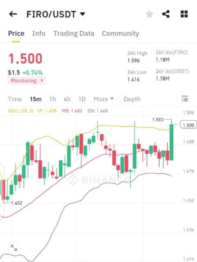FIRO sta attualmente testando la banda superiore di Bollinger a $1.500. Superare $1.498 potrebbe spingere il prezzo verso $1.520. Fai attenzione alla conferma del volume per garantire un breakout sostenibile.
