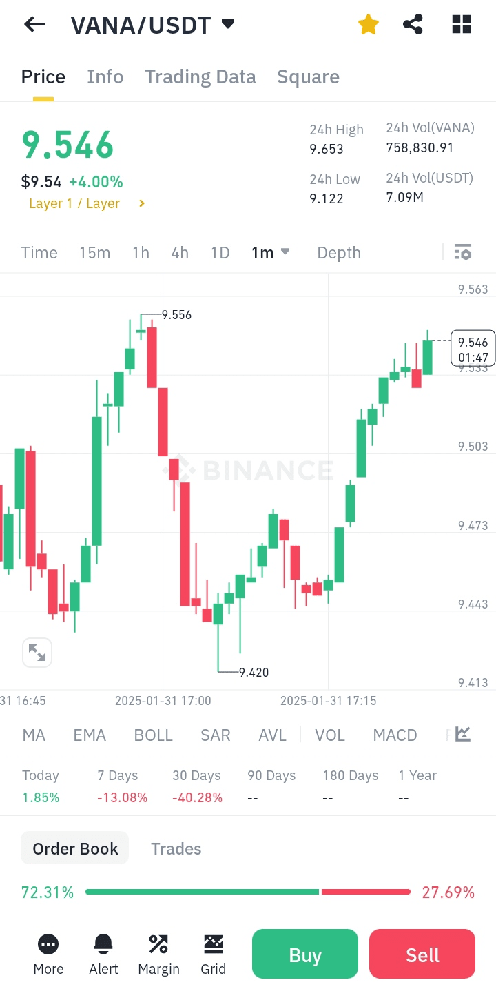 /USDT il coppia è in un viaggio volatile, aumentando del 4% a $9.546, mostrando un promettente slancio con un massimo di 24 ore di $9.653 e un impressionante volume di scambi di 758.830,91 VANA. Nonostante un significativo calo del 13,08% negli ultimi 7 giorni e del 40,28% negli ultimi 30 giorni, il recupero dell'1,85% di oggi suggerisce un potenziale inversione in arrivo. Le candele verdi che dominano i recenti minuti suggeriscono un sentiment rialzista che sta riconquistando terreno. $BTC Tuttavia, i trader devono rimanere vigili, poiché il 72,31% di sentiment di acquisto del mercato è contrastato dal 27,69% di pressione di vendita, il che potrebbe portare a uno scontro tra tori e orsi. Se VANA può superare e mantenere sopra $9.653, un'impennata verso $XRP 10+ potrebbe essere all'orizzonte. In caso contrario, il livello di supporto di $9.12 potrebbe affrontare un nuovo test. Allacciate le cinture; il viaggio è tutt'altro che finito!