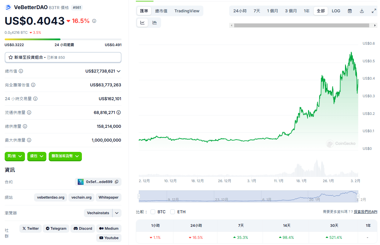 Anche oggi, nonostante il grande crollo del mercato, B3TR ha ancora mostrato un aumento del 35% negli ultimi sette giorni, un aumento del 98% negli ultimi 14 giorni e un aumento del 520% negli ultimi 30 giorni, dimostrando quanto sia forte il sentimento rialzista della comunità di VeBetterDAO nei confronti di B3TR.