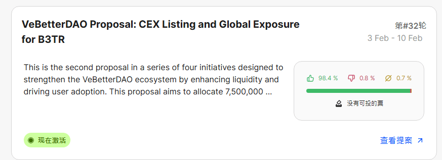 La proposta principale è di utilizzare 7,5 milioni di B3TR dal tesoro della fondazione, cercando di quotarsi su CEX di seconda o prima linea, e aumentando la visibilità e il volume di scambi di B3TR attraverso competizioni di trading, attività comunitarie, eventi di apprendimento, ecc.