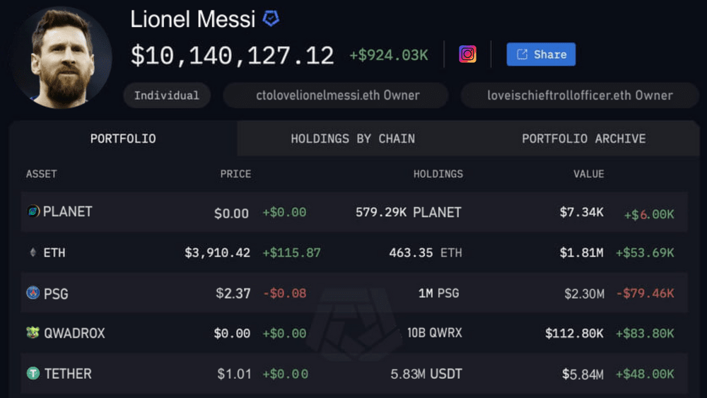 Gli specialisti di Arkham hanno condotto un'analisi e hanno scoperto quali criptovalute alternative sta acquisendo il famoso giocatore di football. L'investimento complessivo è stimato in 10 milioni di dollari e gli acquisti vengono effettuati regolarmente. Considerando che il patrimonio netto di Messi è stimato in 450 milioni di dollari, la criptovaluta rappresenta circa il 2,5% del suo patrimonio netto. Tuttavia, la stella del calcio sta attivamente acquistando monete promettenti del valore di circa 10 milioni di dollari (oltre il 2% della sua fortuna) e le sta promuovendo sui social network.
