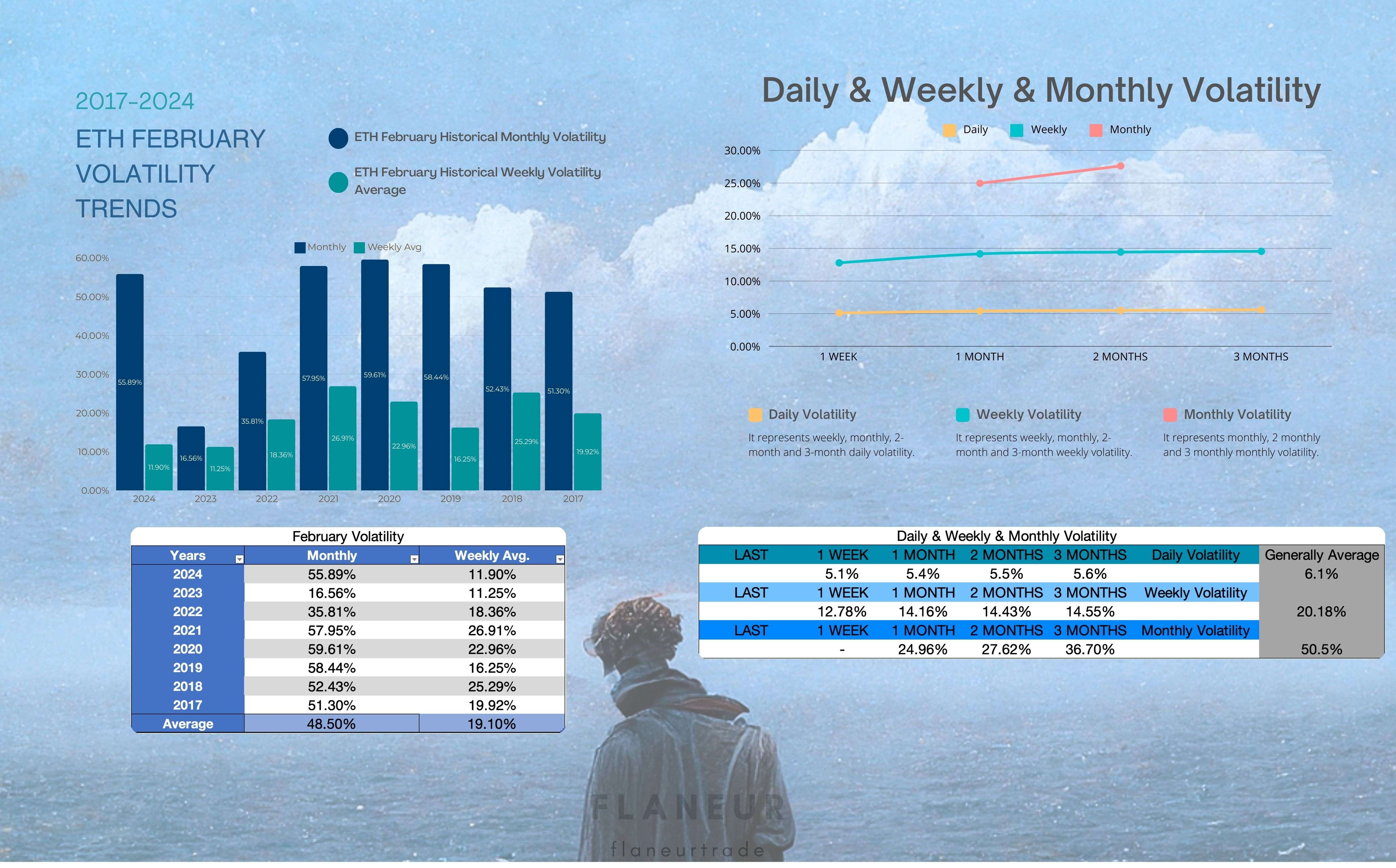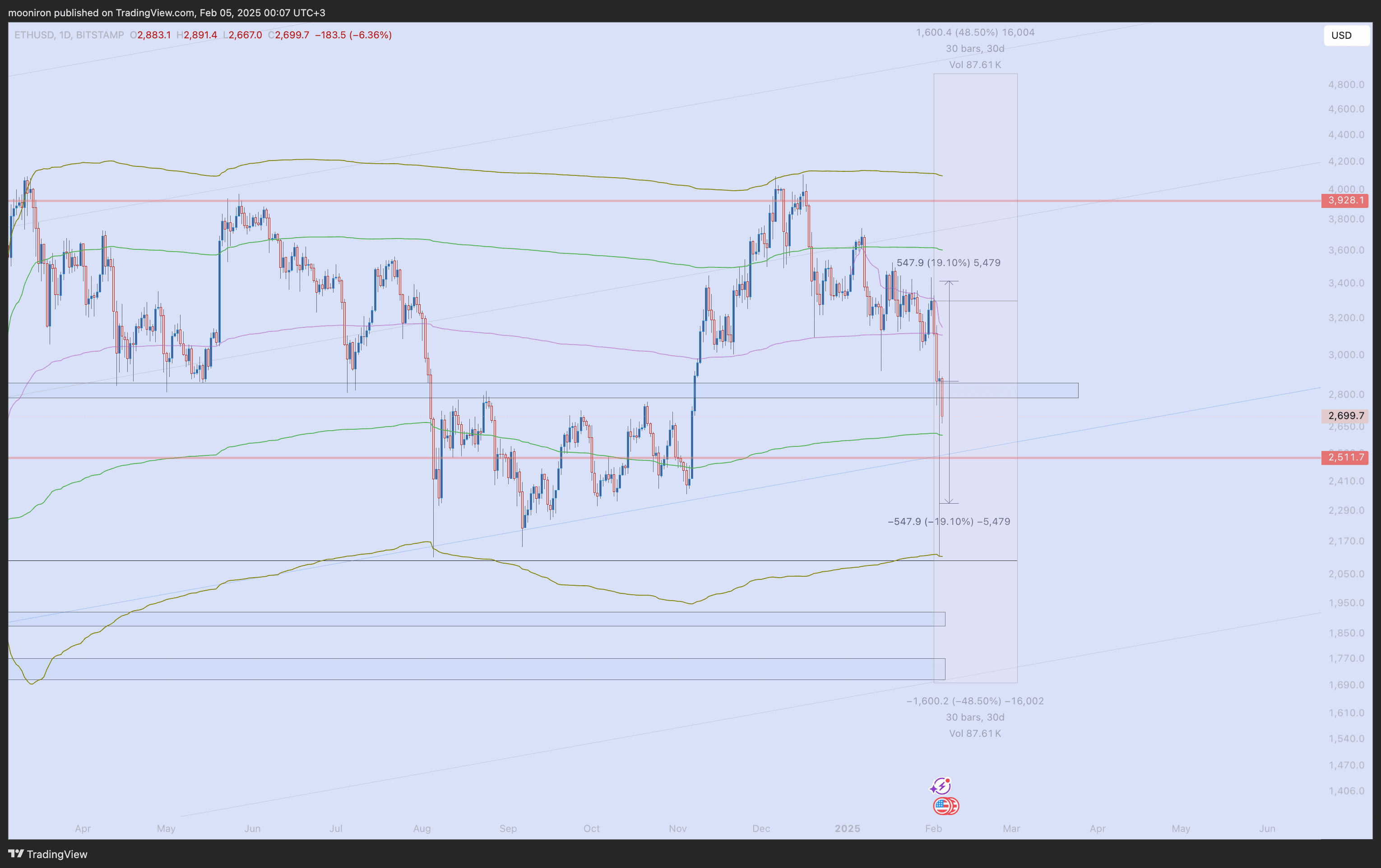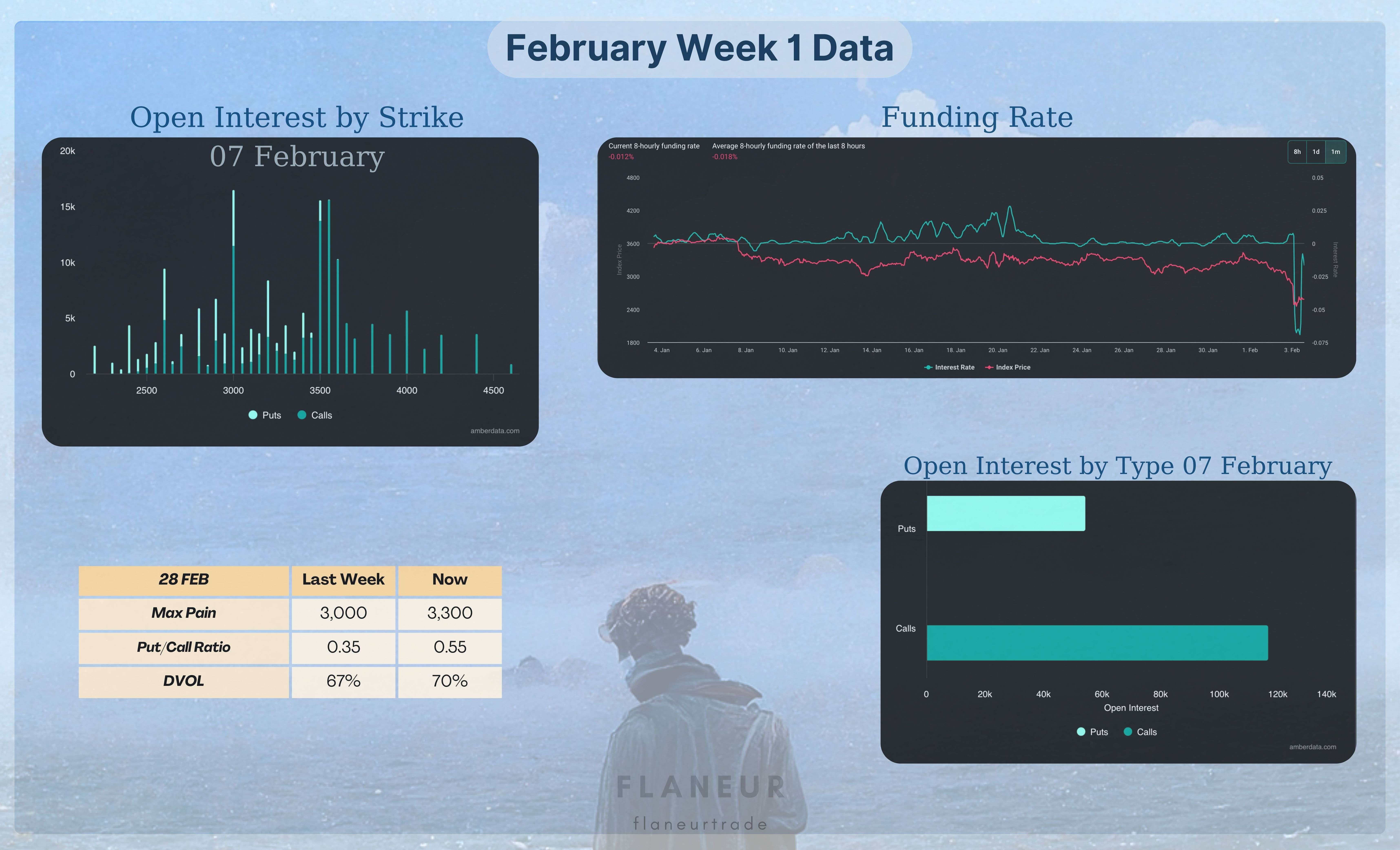 La volatilità implicita mensile di febbraio è in media del 48,5%, corrispondente all'intervallo 1700-4900. La volatilità implicita settimanale è in media del 19,1%, corrispondente all'intervallo 2300-3400. Infatti, con un calo del 35,8% rispetto all'apertura mensile e del 26,2% rispetto all'apertura settimanale, la maggior parte di queste volatilità è stata consumata. Infatti, più della volatilità totale di gennaio.