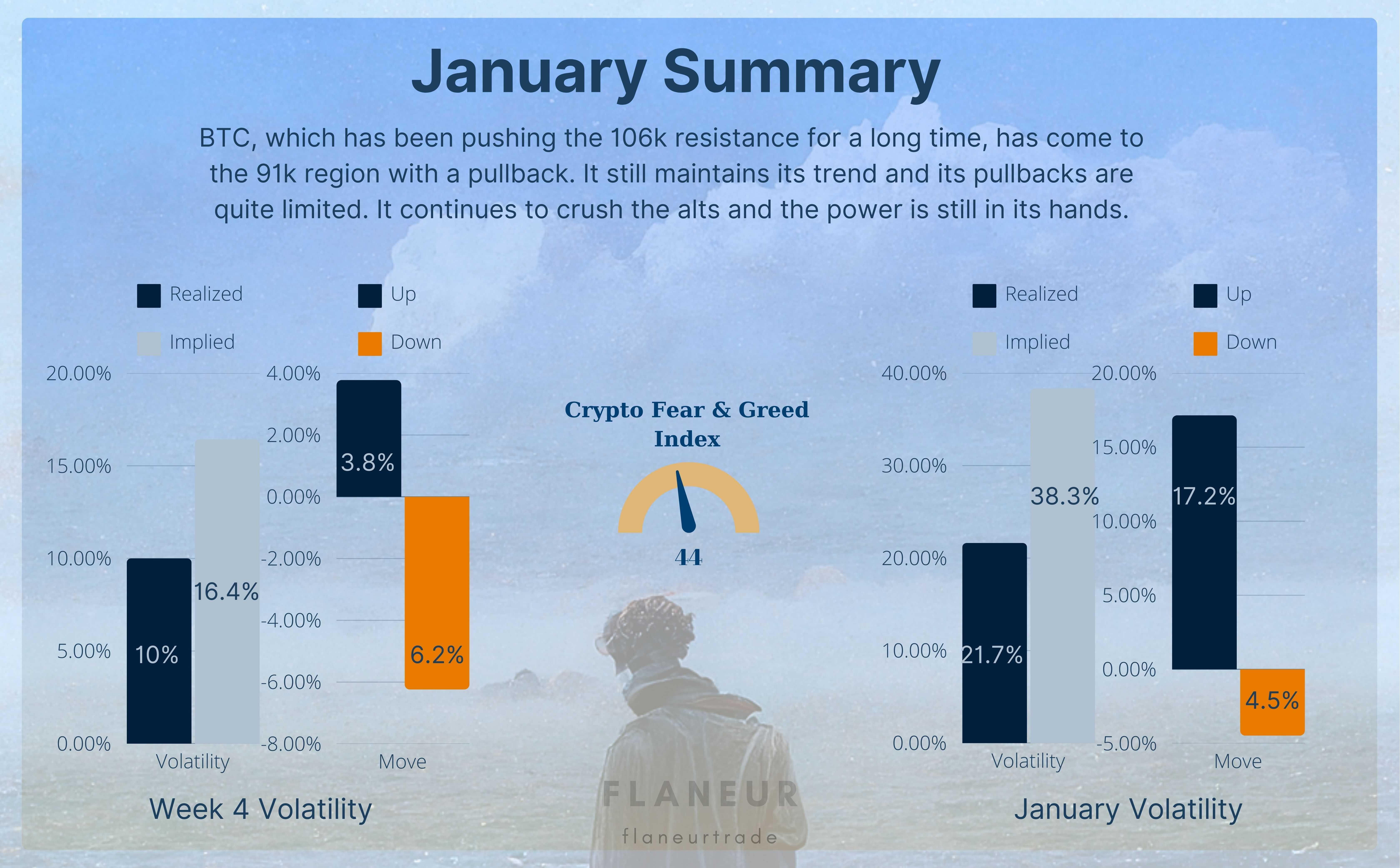 La volatilità di gennaio è rimasta al di sotto delle aspettative con il 21,7%, mostrando per lo più un movimento laterale. Verso la fine del mese, ha trascinato il mercato verso il basso con cali. BTC, che è sceso del 10% rispetto all'apertura mensile, attualmente scambia il 3% sopra di essa. La reazione è stata piuttosto forte, con la candela giornaliera che ha raccolto tutto il calo e si è invertita verso l'alto. Le chiusure giornaliere di oggi e di domani saranno significative.