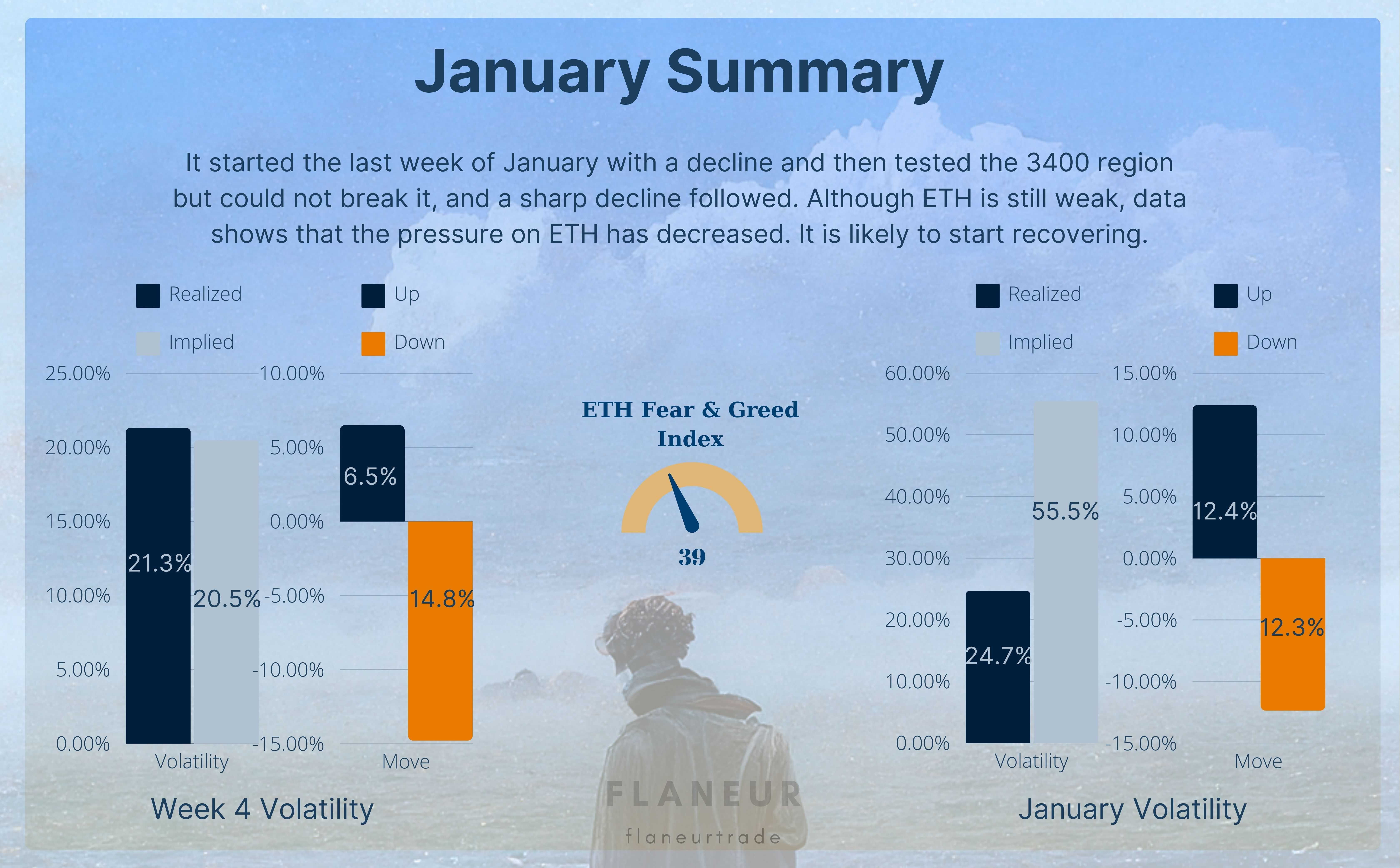 ETH ha chiuso gennaio con una volatilità del 24,7%, mostrando una volatilità alta del 21% nell'ultima settimana. Il movimento dei prezzi è stato piuttosto pesante e significativamente sotto le prestazioni di Bitcoin. Durante il recente calo, hanno subito cali del 15-30% insieme ad altre altcoin. Attualmente scambia il 17% sotto l'apertura mensile e il 4,5% sotto l'apertura settimanale.
