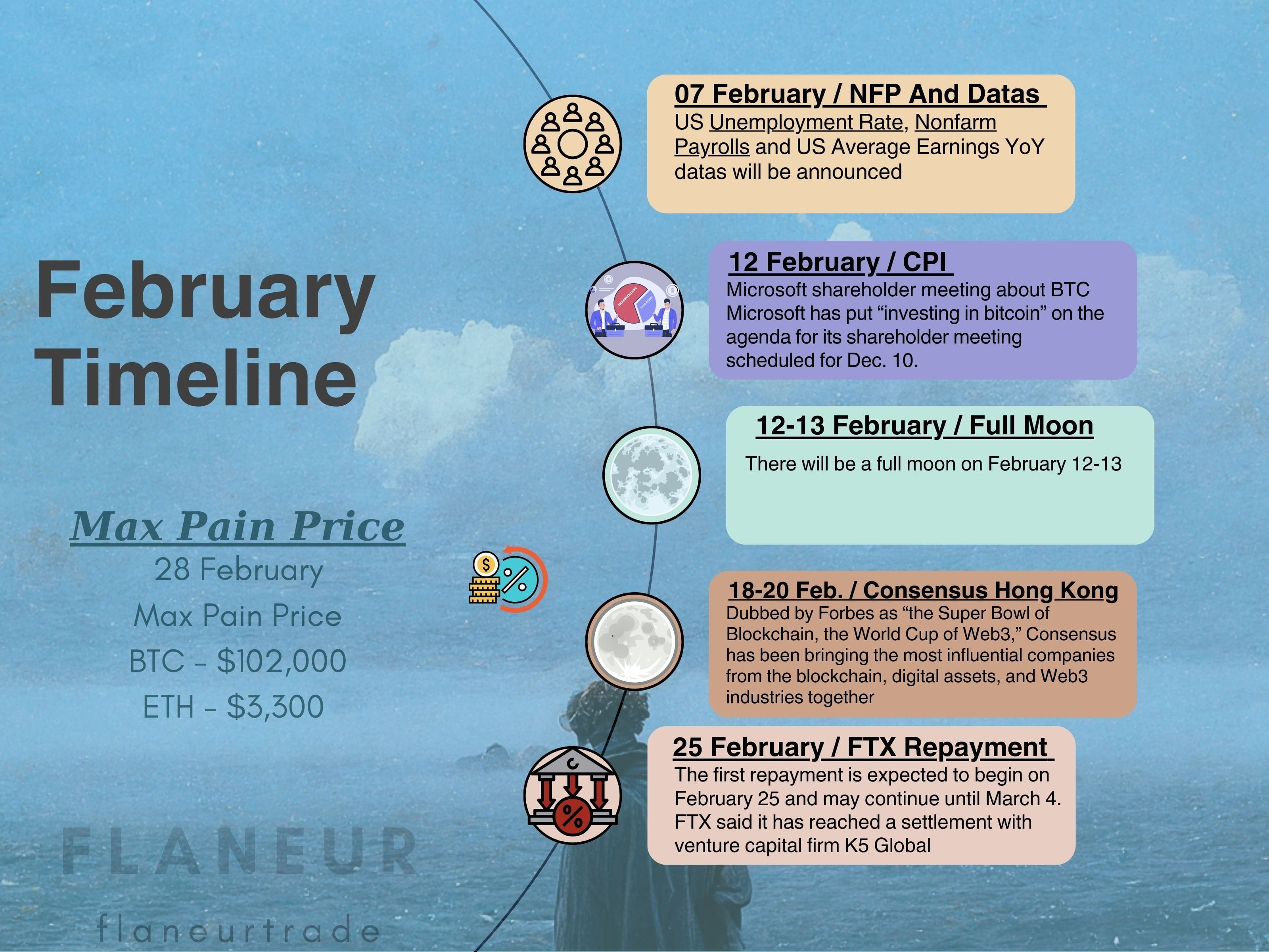 Saluti dopo una lunga pausa. Siamo entrati in una settimana di forti vendite dopo la chiusura del mese. Sebbene BTC non abbia effettuato un ritracciamento significativo, abbiamo assistito a cali fino al 30% in ETH e nelle altcoin. In precedenza avevo condiviso grafici su Twitter che indicavano queste potenziali vendite. Febbraio porta significativi sviluppi ed eventi che influenzeranno il futuro delle criptovalute. Esaminiamo ciò che ci attende. I dati sull'inflazione che arriveranno il 12 febbraio sono cruciali poiché determineranno i futuri tagli dei tassi d'interesse e le politiche monetarie. Inoltre, i rimborsi FTX inizieranno alla fine di febbraio, il che rappresenta notizie altamente impattanti sui prezzi.