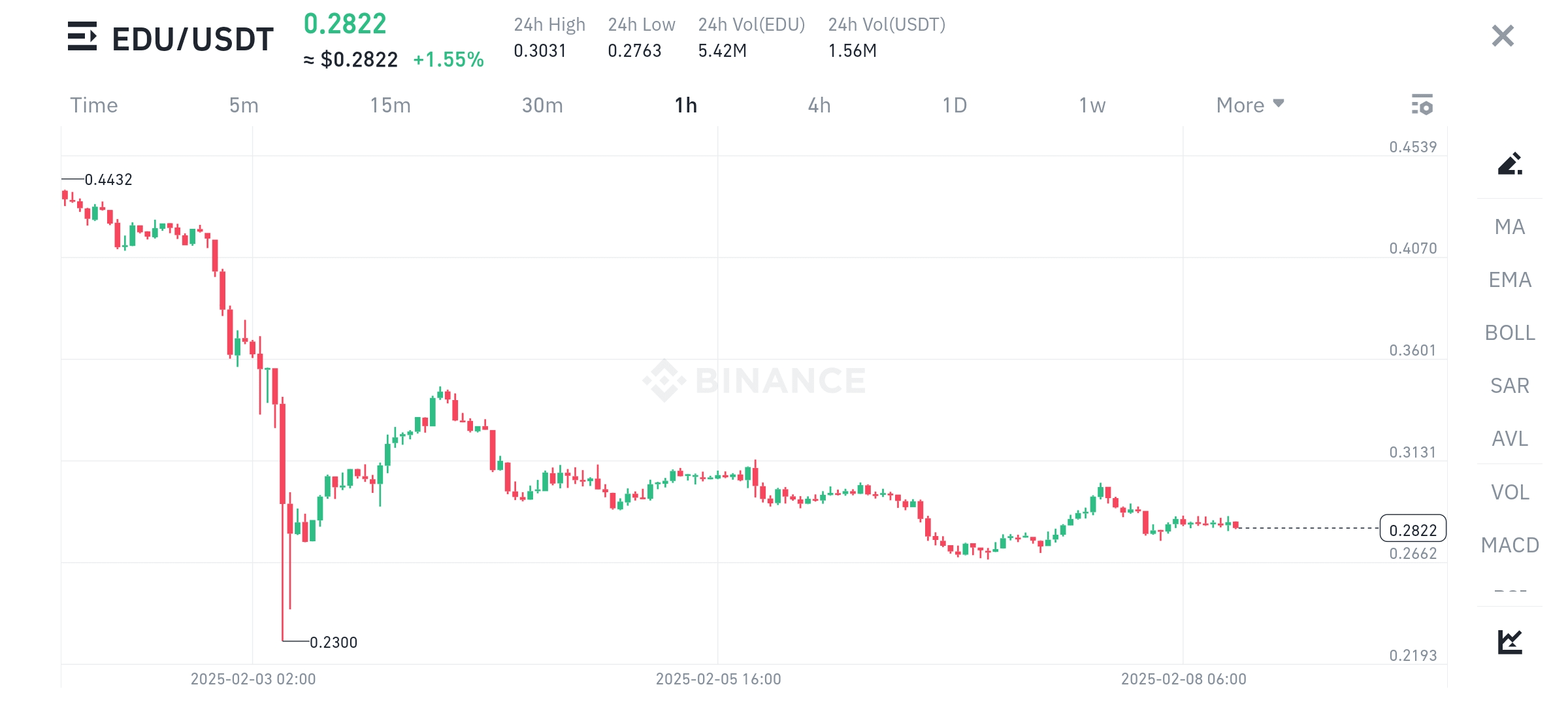 La coppia EDU/USDT sta attualmente scambiando a $0.2822, riflettendo un aumento dell'1.55% nelle ultime 24 ore. Il trend complessivo del mercato rimane laterale, poiché il prezzo è fluttuato all'interno di un range ristretto da $0.2763 a $0.3031. Questo indica indecisione nel mercato, dove né i rialzisti né i ribassisti hanno stabilito una posizione dominante.