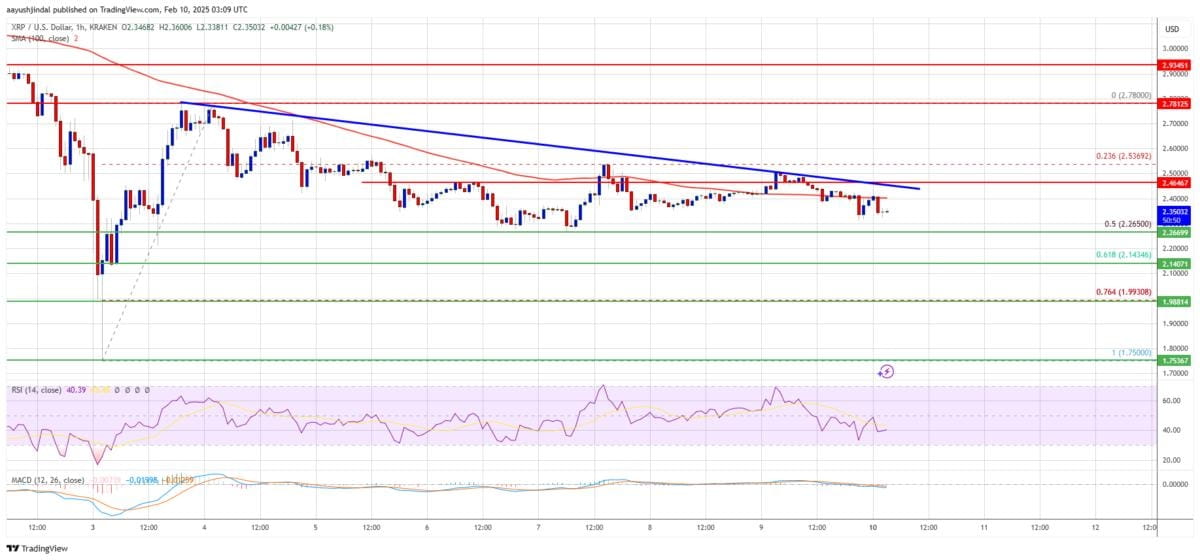 Il prezzo ora sta scambiando sotto $2.50 e la Media Mobile Semplice a 100 ore. Al rialzo, il prezzo potrebbe affrontare resistenza vicino al livello di $2.450. C'è anche una linea di tendenza ribassista che si forma con resistenza a $2.4650 nel grafico orario della coppia XRP/USD.