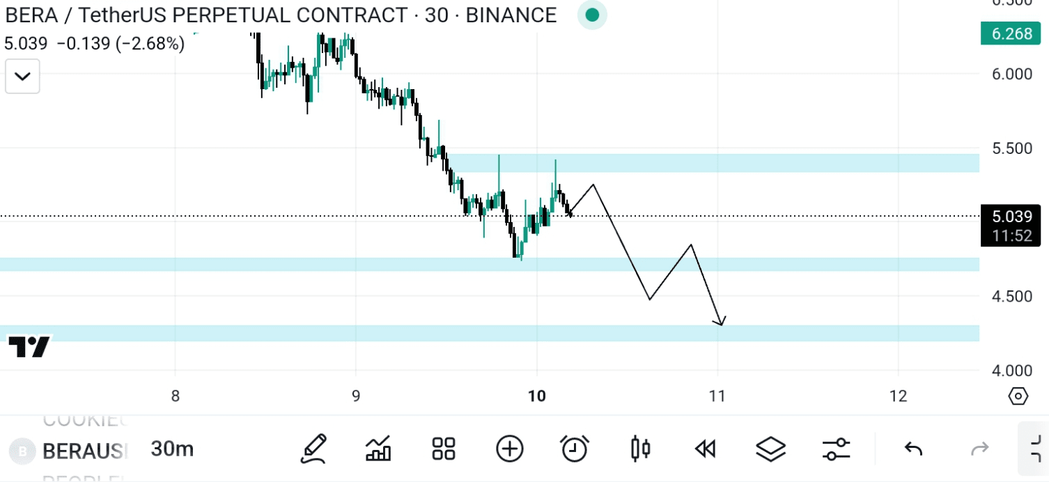$BERA è in ribasso, se guardi bera come un'azione di prezzo, sta continuamente formando minimi più bassi e la mia regola è che in ribasso, la candela di rifiuto dovrebbe formarsi a resistenza con basso volume e non dovrebbe esserci stoppino nella candela, come puoi vedere, lo stesso setup si sta formando in Bera anche al livello di $5.4... Facciamo short🎯
