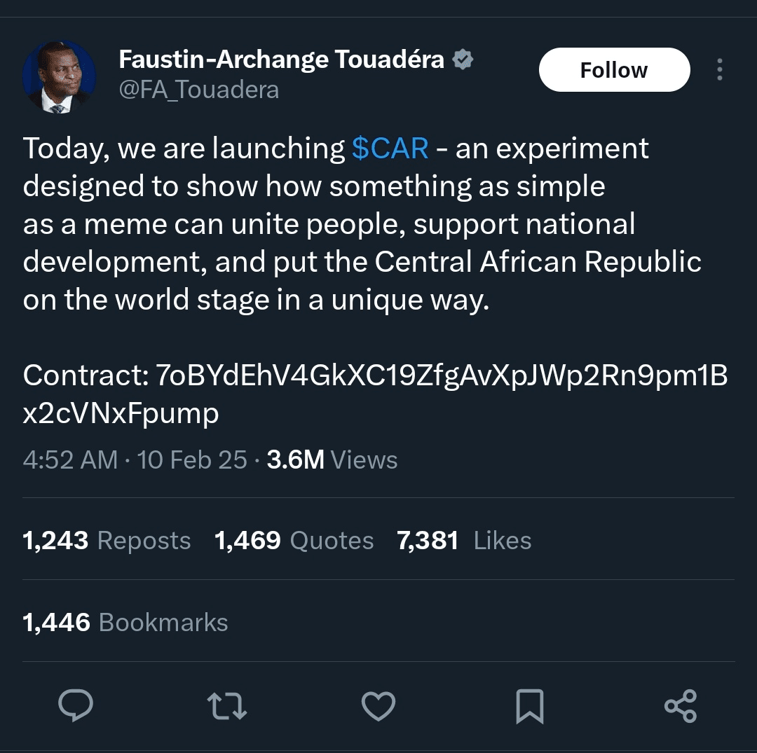 La Repubblica Centrafricana lancia il memecoin come esperimento, secondo l'account X del presidente 🚀