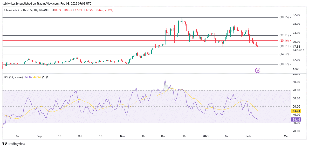 I livelli di Fibonacci aiutano a determinare i punti di supporto e resistenza. Attualmente, LINK sta scambiando appena sopra il livello di supporto di 18,01 dollari. Se non riesce a mantenere questo livello, il prezzo troverà il prossimo supporto a 14,52 dollari, in linea con l'area di domanda secondo IOMAP.