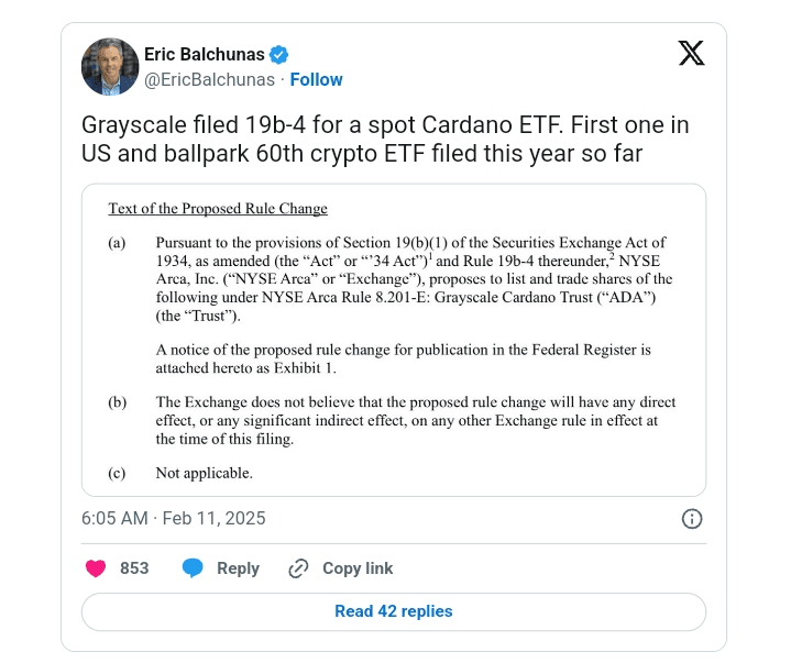 Grayscale Investments ha ufficialmente presentato domanda per lanciare un fondo negoziato in borsa (ETF) su Cardano alla Borsa di New York, segnando un'importante pietra miliare per la comunità ADA. La proposta, presentata da NYSE Arca per conto delle informazioni sull'investimento di Grayscale, cerca di quotare e negoziare azioni del Grayscale Cardano Trust. Questo passo posiziona Grayscale tra altri gestori di attivi in corsa per lanciare ETF cripto e rappresenta anche la prima volta che Grayscale offre un prodotto autonomo dedicato esclusivamente a Cardano, separato dai suoi fondi più grandi.