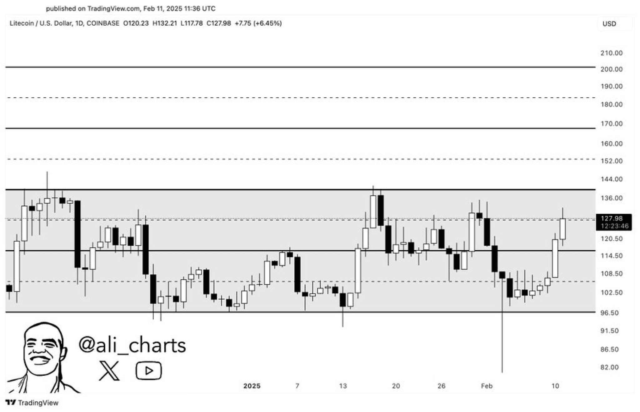 Assumendo che le condizioni di mercato rimangano rialziste, Litecoin potrebbe potenzialmente salire verso *150* entro il *Q2 2025*, specialmente man mano che si avvicina all'evento di *halving*. Tuttavia, questo dipenderĂ dal *sentiment di mercato* e dall'*azione del prezzo di Bitcoin*.