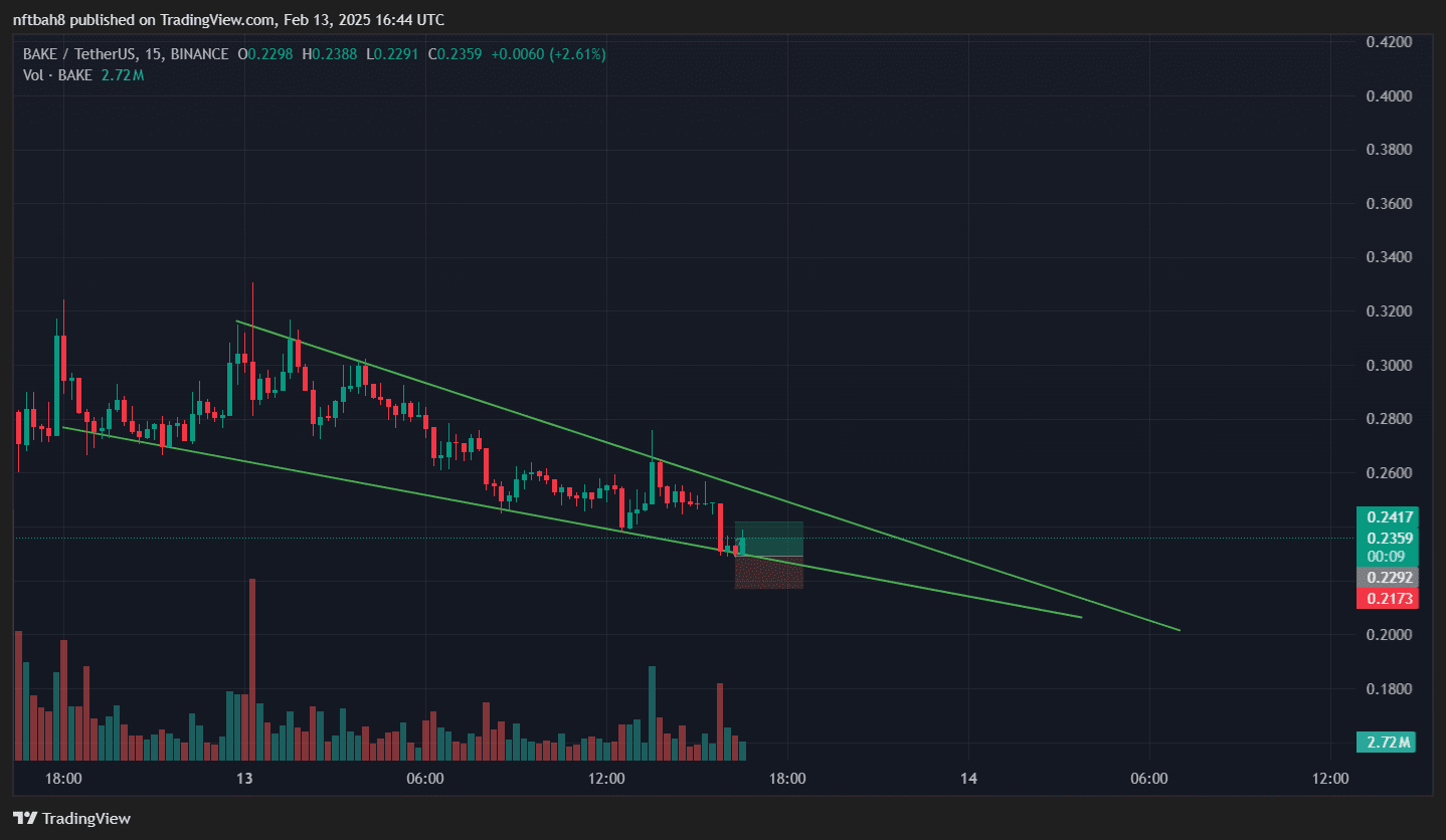 $BAKE si trova attualmente in un pattern a cuneo discendente sul grafico a 15 minuti (15m), noto per avere una maggiore probabilità di rompersi al rialzo. Al momento in cui analizzo, il prezzo sta testando la base di questo cuneo, il che potrebbe rappresentare una buona opportunità per operazioni di Scalping, considerando la possibilità di una reazione positiva se rispettasse questo supporto e avanzasse verso la rottura del pattern.