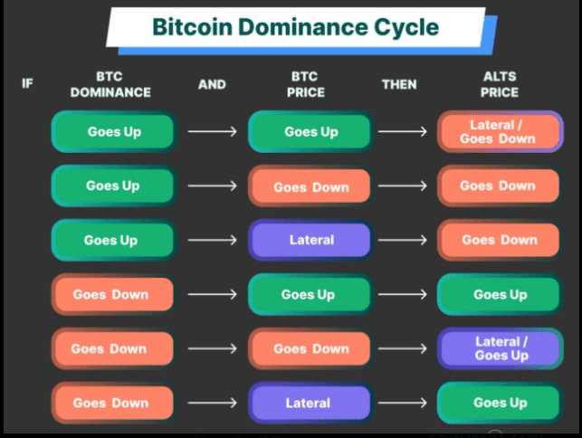 Il grafico sopra illustra il Ciclo di Dominanza di Bitcoin, che mostra come la relazione tra la dominanza di BTC e il prezzo di BTC influisce sui prezzi degli altcoin. Analizziamolo: