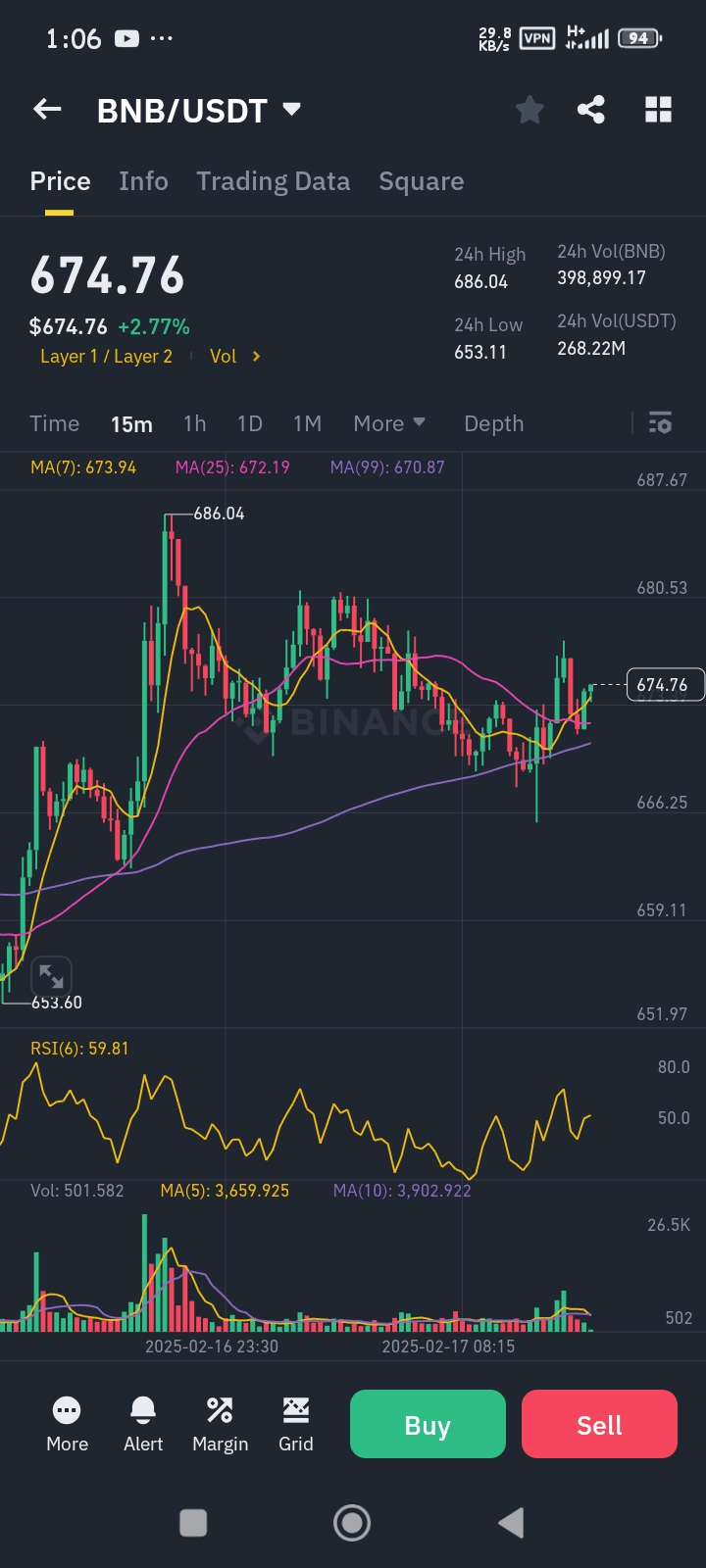 $BNB /USDT è attualmente scambiato a $ 674,76, riflettendo un aumento di prezzo del +2,77%. L'asset ha sperimentato un forte slancio rialzista, raggiungendo un massimo di 24 ore di $ 686,04 prima di tornare a un minimo di $ 653,11.