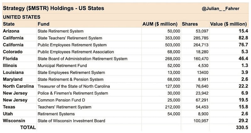 Secondo l'analista di Bitcoin Julian Fahrer, il totale delle partecipazioni azionarie di MicroStrategy da parte di dodici fondi pensione statali e tesorerie degli Stati Uniti ha raggiunto i 330 milioni di dollari alla fine del 2024.