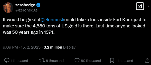 💬 ZeroHedge ha suggerito che Musk verifichi personalmente Fort Knox, poiché non è stato auditato correttamente dal 1974.
