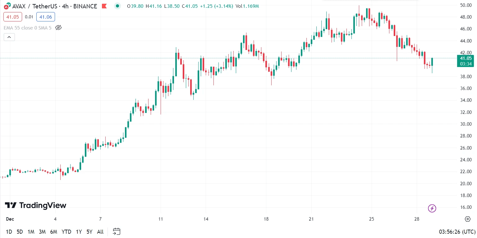 Grafico a 4 ore della coppia AVAX/USDT su Binance alle 03:56 del 29 dicembre 2023 (UTC)