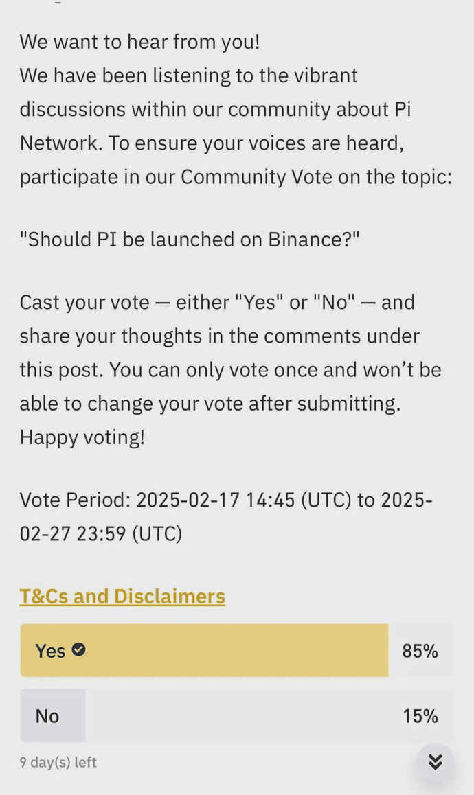 “Abbiamo ascoltato le vivaci discussioni all'interno della nostra comunità riguardo a Pi Network. Per garantire che le voci degli utenti siano ascoltate, Binance sta lanciando un Voto della Comunità. Invitiamo gli utenti a partecipare e condividere le loro opinioni sul tema: “Dovrebbe PI essere lanciato su Binance?” sotto il post ufficiale su Binance Square Official,” recita la comunicazione.