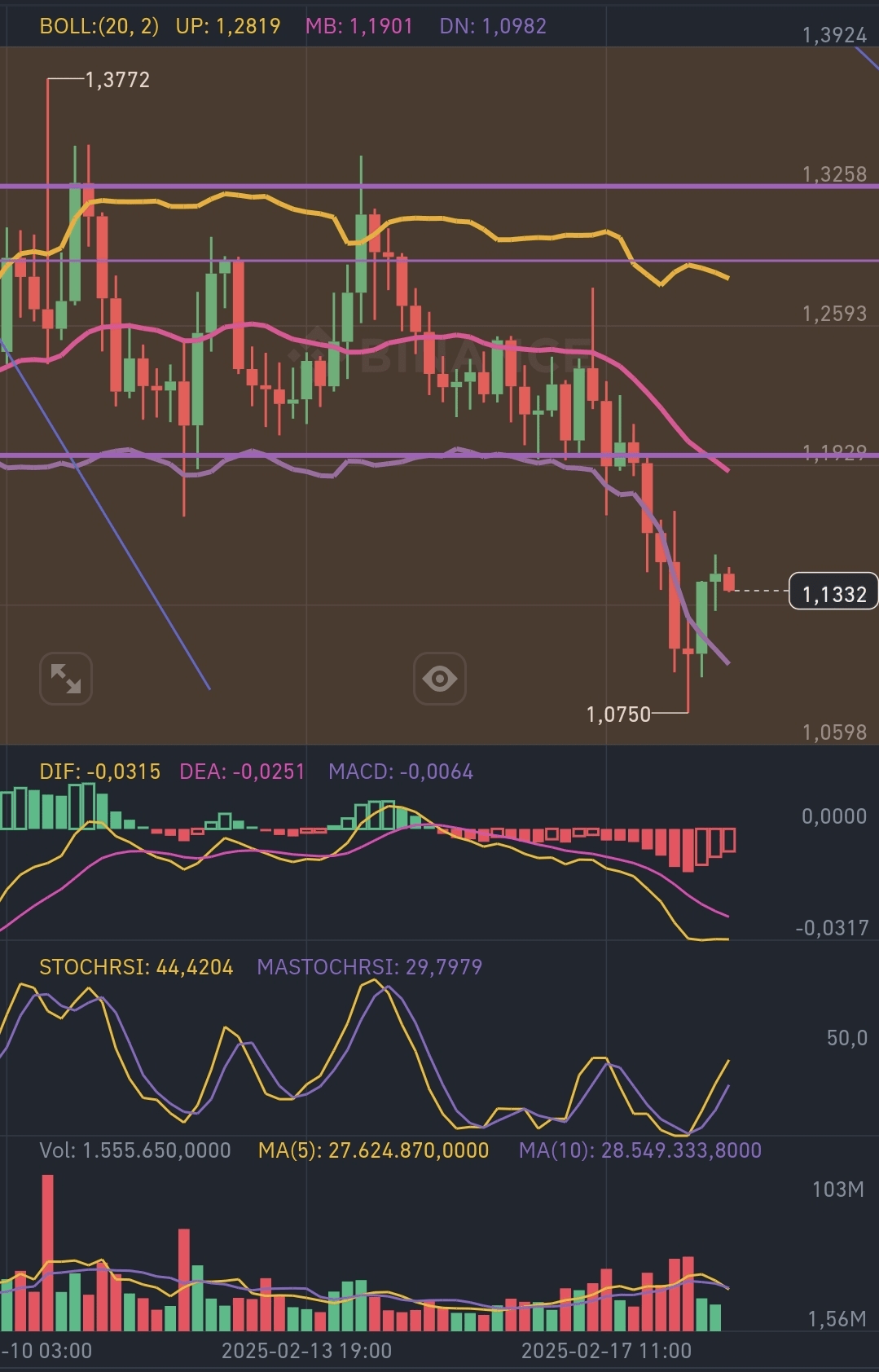 MACD a -0.0058 con istogramma ancora in rosso, il che indica che la tendenza ribassista rimane attiva, ma con possibile rallentamento.
