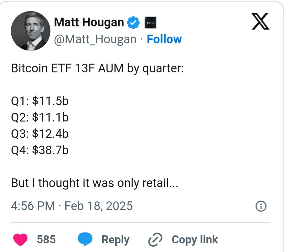 Gli investitori istituzionali nel periodo da ottobre a dicembre hanno destinato a spot bitcoin-ETF $38,7 miliardi - 3,1 volte di più rispetto al trimestre precedente ($12,4 miliardi).