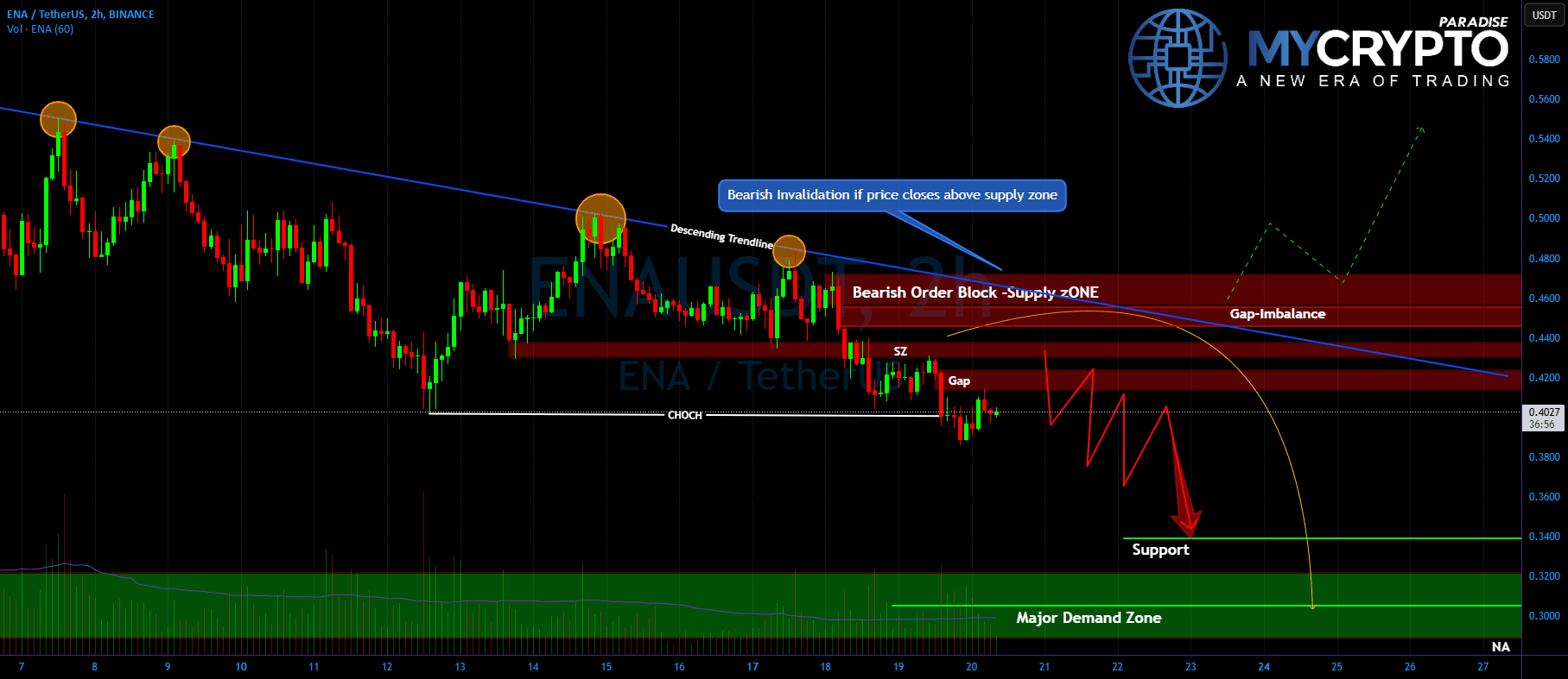 💎#ENAUSDT ha recentemente formato un Change of Character (CHOCH) lasciandosi alle spalle una zona di fornitura e uno squilibrio. Attualmente, ci aspettiamo una correzione al rialzo verso $0,4333 e $0,4507, ma è probabile che questa mossa sia di breve durata. Se il prezzo tocca questi livelli e incontra una forte resistenza, aspettatevi un netto rifiuto, soprattutto con la linea di tendenza discendente e l'EMA 50 che agiscono come barriere allo slancio rialzista. Questa configurazione suggerisce che ENA è in una posizione privilegiata per un ulteriore ribasso a meno che non superi la zona di fornitura.