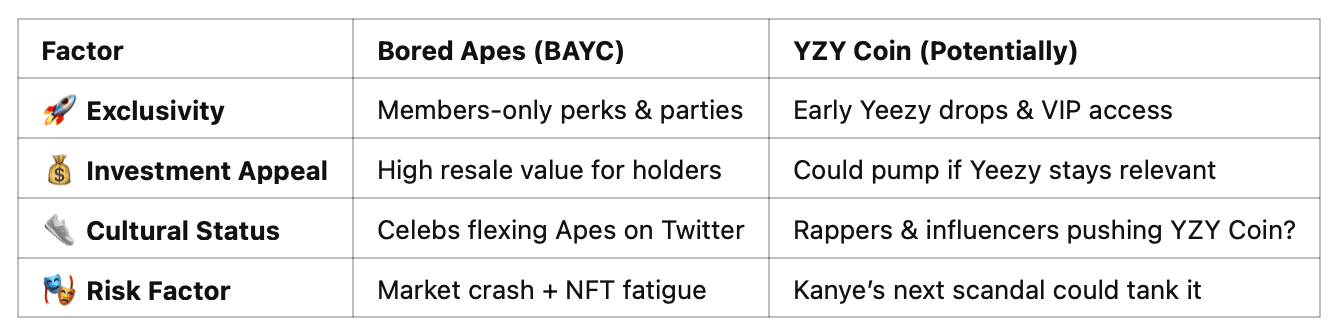 🤔 YZY Coin potrebbe essere più grande dei Bored Apes? Forse — se va oltre l'hype e costruisce una reale utilità.