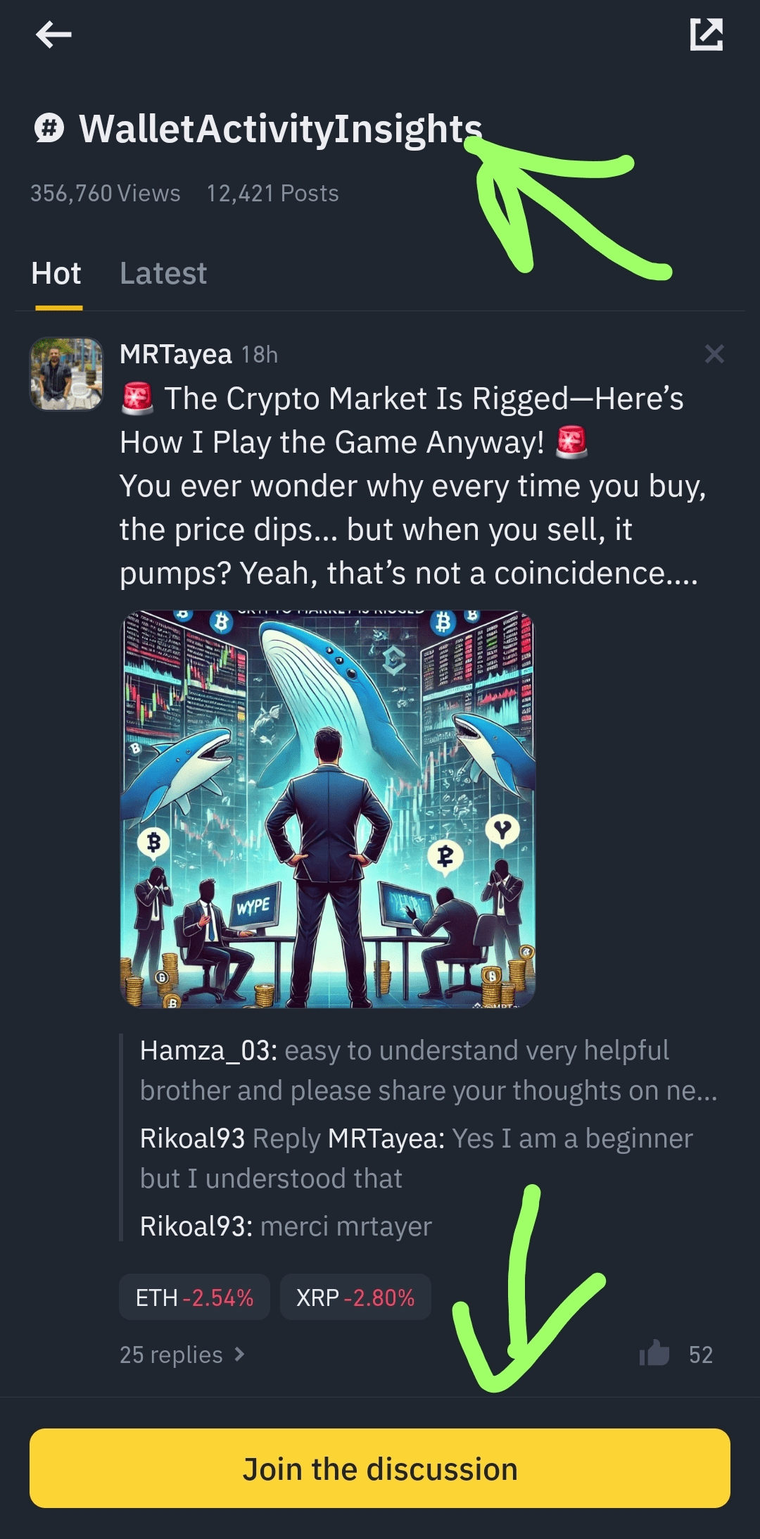 7) Sarai inviato alla pagina degli hashtag o alla pagina delle monete. Nella pagina delle monete clicca sulla casella di testo in fondo, per la pagina degli hashtag clicca sul pulsante unisciti alla conversazione