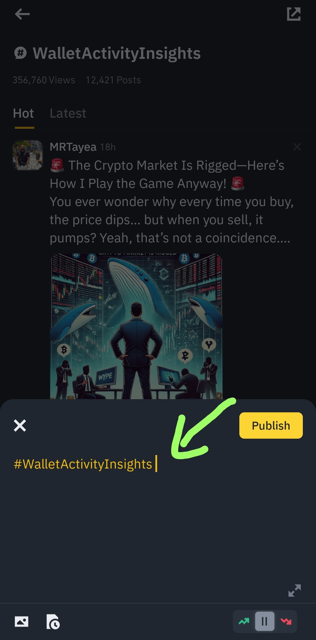 8) In entrambi i casi si avvierà un post e verrà aggiunta automaticamente un'etichetta come questa #ActiveUserImpact puoi spostarla dove vuoi nel post ma non dovresti aggiungere altri hashtag e altre etichette di monete.