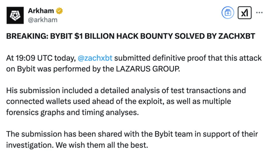 ZachXBT ha anche confermato che questo attacco è correlato al gruppo di hacker nordcoreano Lazarus Group, che ha fatto della realizzazione di attacchi informatici transnazionali e del furto di criptovalute una delle sue principali attività. Secondo quanto riferito, le prove fornite da ZachXBT, inclusi test di transazione, portafogli correlati, grafici di evidenza e analisi temporale, mostrano che gli attaccanti hanno utilizzato tecniche comuni del gruppo Lazarus in diverse operazioni. Allo stesso tempo, Arkham ha dichiarato che tutti i dati pertinenti sono stati condivisi con Bybit per aiutare la piattaforma a condurre ulteriori indagini.
