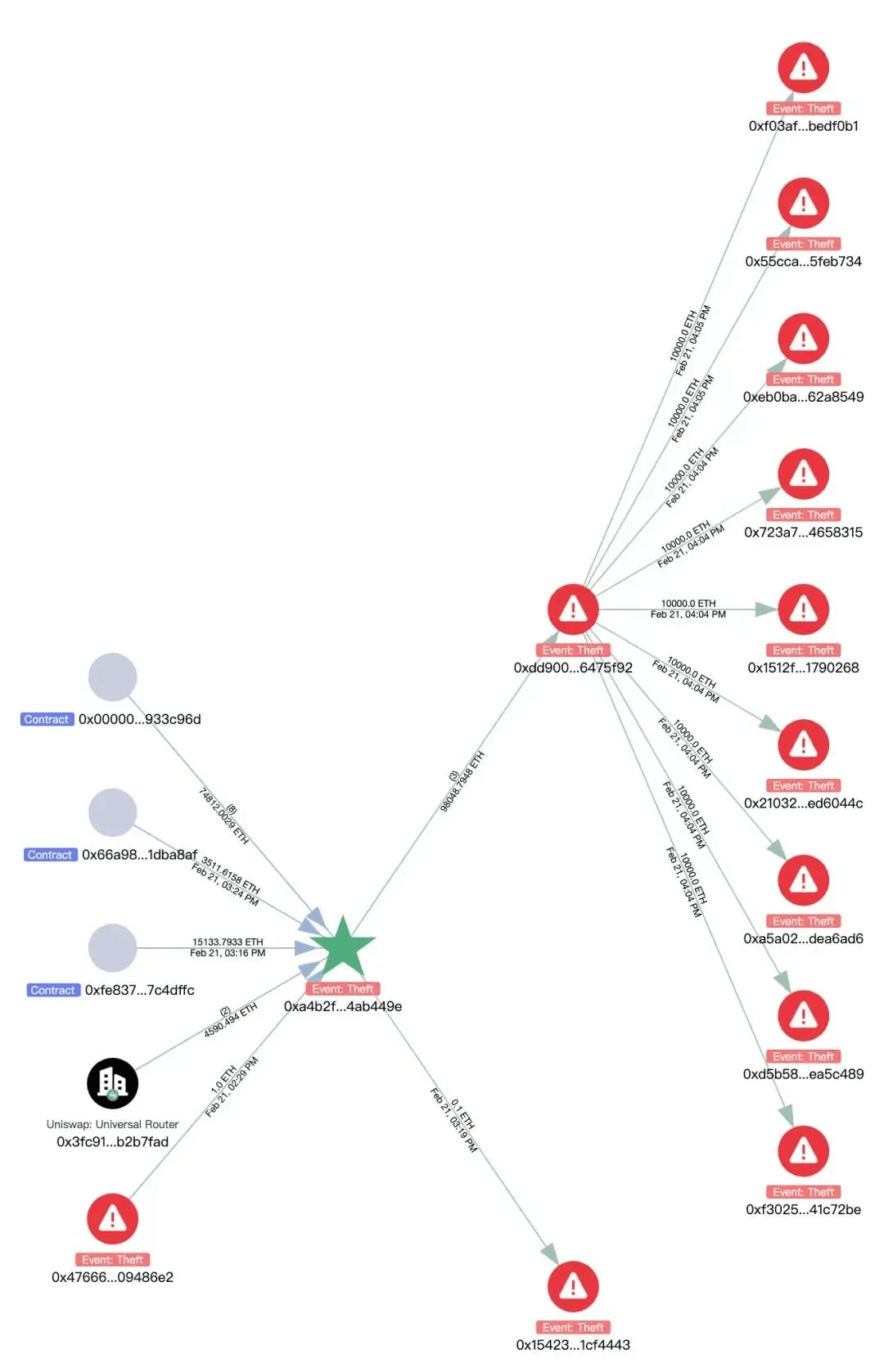 Successivamente, attraverso Uniswap e ParaSwap, sono stati scambiati in 98.048 ETH e poi trasferiti a: