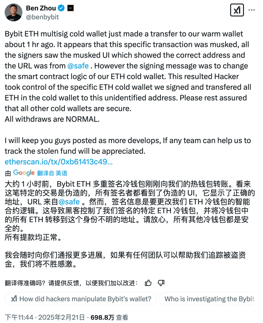 La sera dell'evento, alle 23:44, il CEO di Bybit, Ben Zhou, ha pubblicato una dichiarazione su X, spiegando in dettaglio i dettagli tecnici di questo attacco: