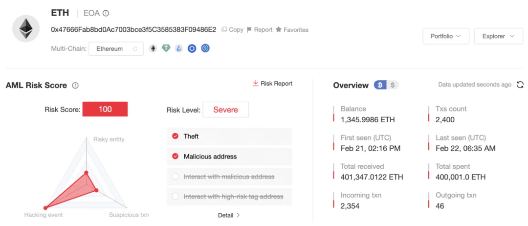 Saldo 1.346 ETH, continueremo a monitorare gli indirizzi correlati.