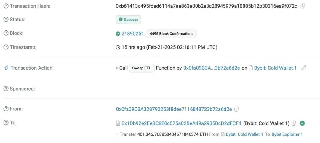 4. Chiamata alla funzione backdoor per trasferire fondi: gli attaccanti hanno utilizzato le funzioni sweepETH e sweepERC20 nel contratto per trasferire tutti i 400.000 ETH e stETH (valore totale di circa 1,5 miliardi di dollari) a un indirizzo sconosciuto.