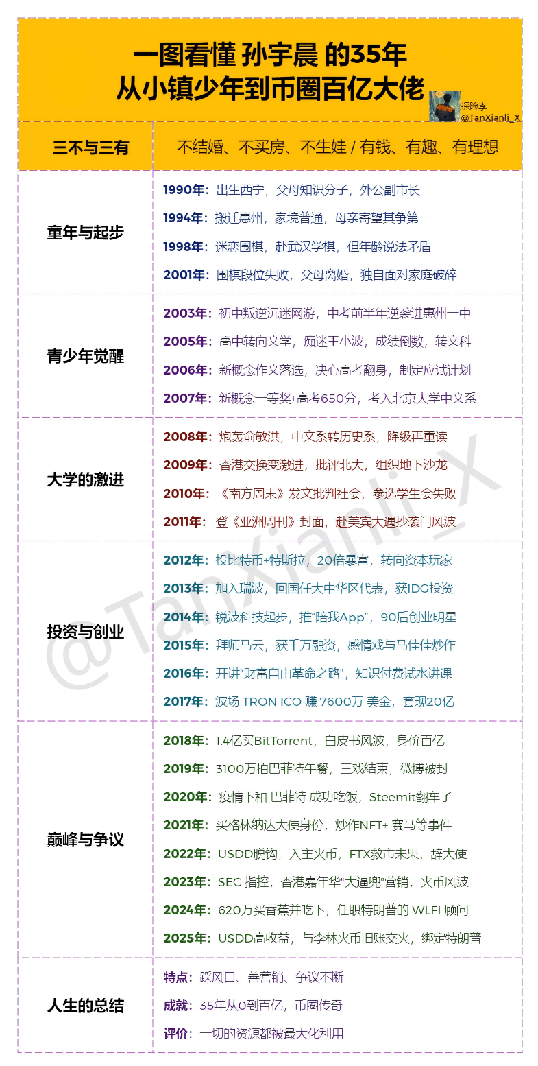 A 35 anni, Sun Yuchen è passato da ragazzo di un piccolo paese a leader nel mondo delle criptovalute, cavalcando l'onda e giocando con il marketing, guadagnando miliardi e "tagliando" innumerevoli. Criticarlo non serve, ma apprendere dai suoi punti di forza è ciò che conta davvero! Nel futuro, continuerà a cavalcare le onde o cadrà dal suo trono? Solo il tempo ci dirà la risposta.