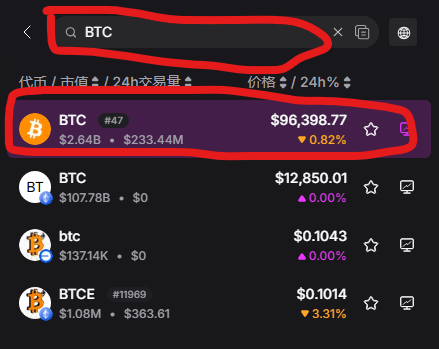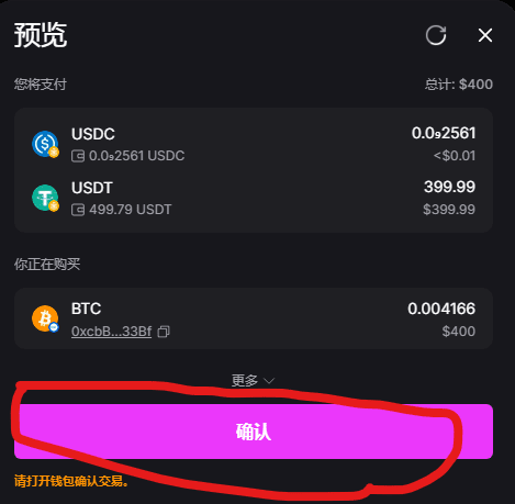 3. Transazione. Clicca sul “nome/token/indirizzo” in cima, inserisci “BTC”, specifica l'importo di USDT, clicca su “acquista”, clicca su “conferma”, e poi conferma nel wallet che appare.