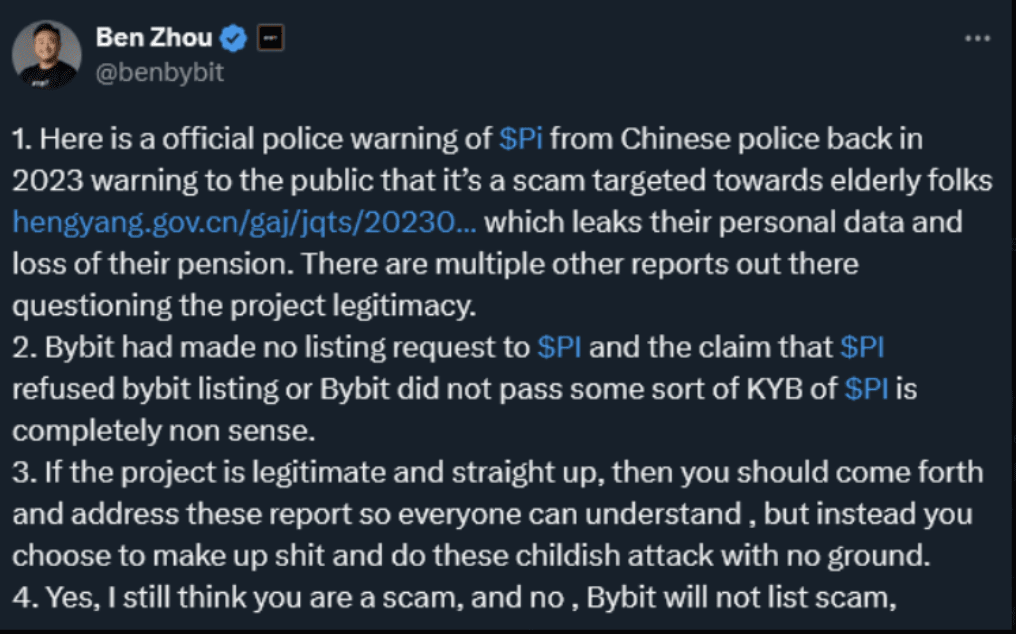 Il CEO di Bybit #BenZhou ha pubblicamente dichiarato che Pi è una truffa e che Bybit non supporterà mai il trading di Pi.