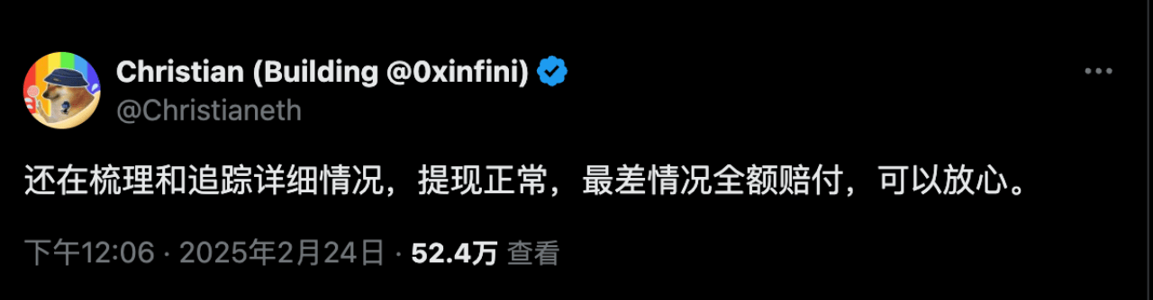 Dopo l'incidente di Infini, Christian ha nuovamente dimostrato il suo senso di responsabilità. Ha dichiarato che il 70% dei 50 milioni di dollari rubati apparteneva a grandi amici conosciuti e ha già parlato con loro uno per uno, promettendo di assumere personalmente le perdite potenziali. Il restante 30% dei fondi sarà reinvestito nel Vault di Infini entro lunedì prossimo, garantendo il normale funzionamento della piattaforma.