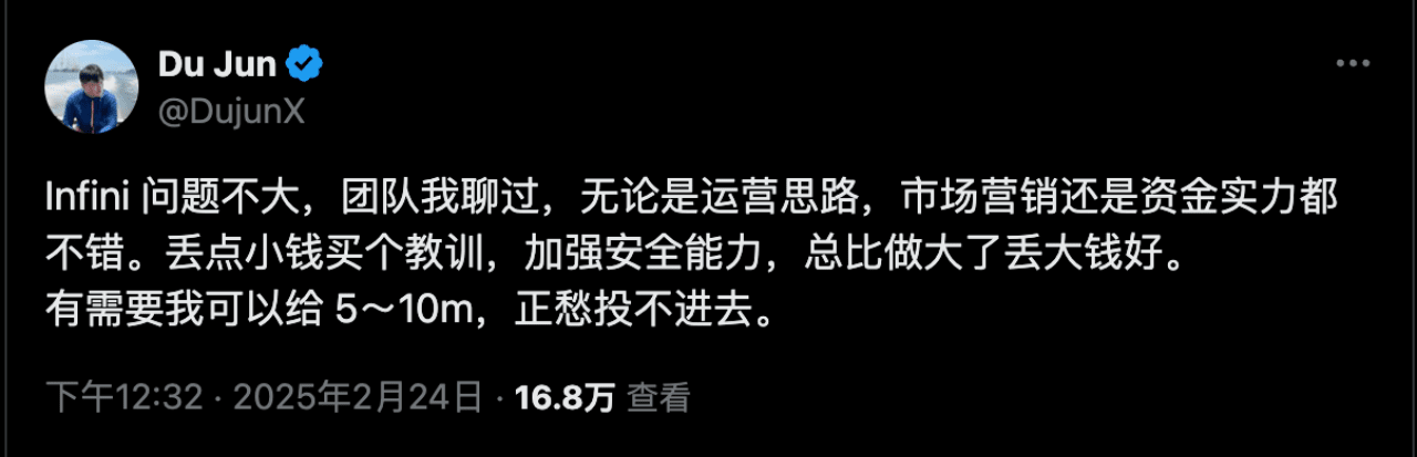 Dopo l'incidente di furto di Infini, la reazione della comunità crypto si è polarizzata. Da un lato, alcuni membri della comunità hanno espresso supporto per la responsabilità di Christian. Du Jun, co-fondatore di ABCDE, ha persino offerto di finanziare Infini con 5-10 milioni di dollari, dicendo: "Perdere un po' di soldi per imparare una lezione è meglio che esporsi a perdite maggiori in futuro".