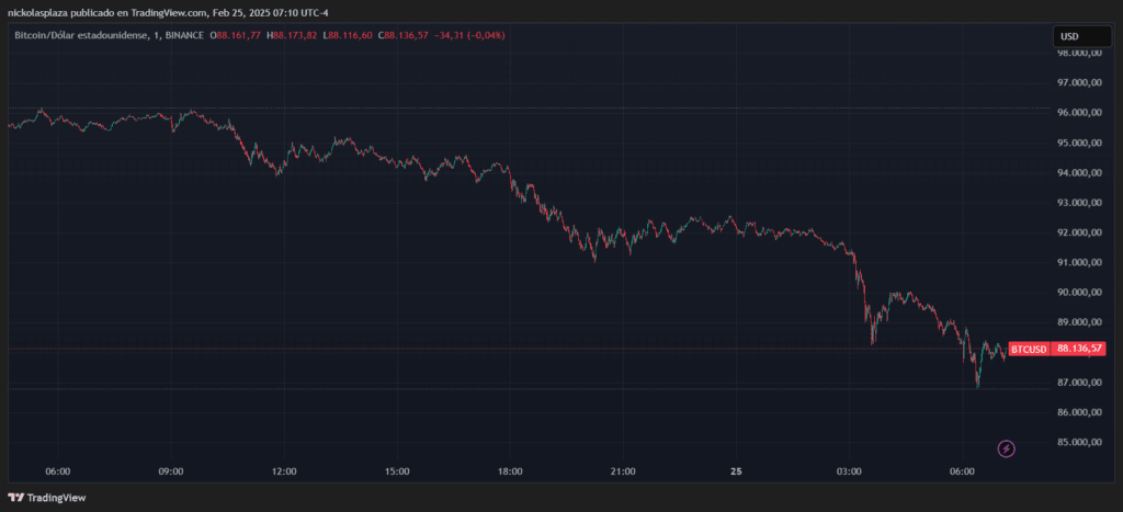 Le liquidazioni massive hanno coinciso con un calo del prezzo di bitcoin dell'8%, portandolo nella zona degli 87.800 dollari, nelle ultime 24 ore, come si può vedere nel grafico di TradingView.