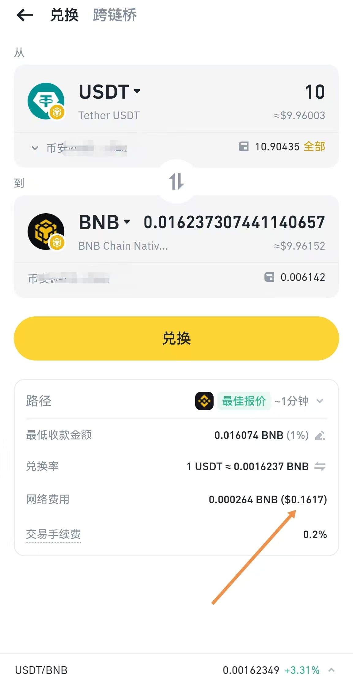 Ho provato, devi scambiare esattamente 0.015, cioè circa 10 dollari, meno non va bene. Ho usato USDT per lo scambio, se dopo non vuoi tenere BNB puoi scambiarlo di nuovo in stablecoin USDT. Una volta completato lo scambio, verifica il compito. La commissione è di circa 0,16 dollari per volta.