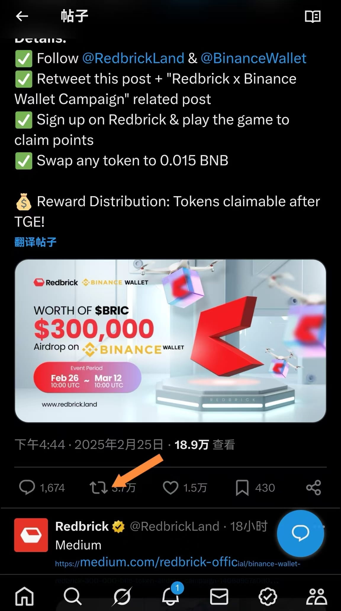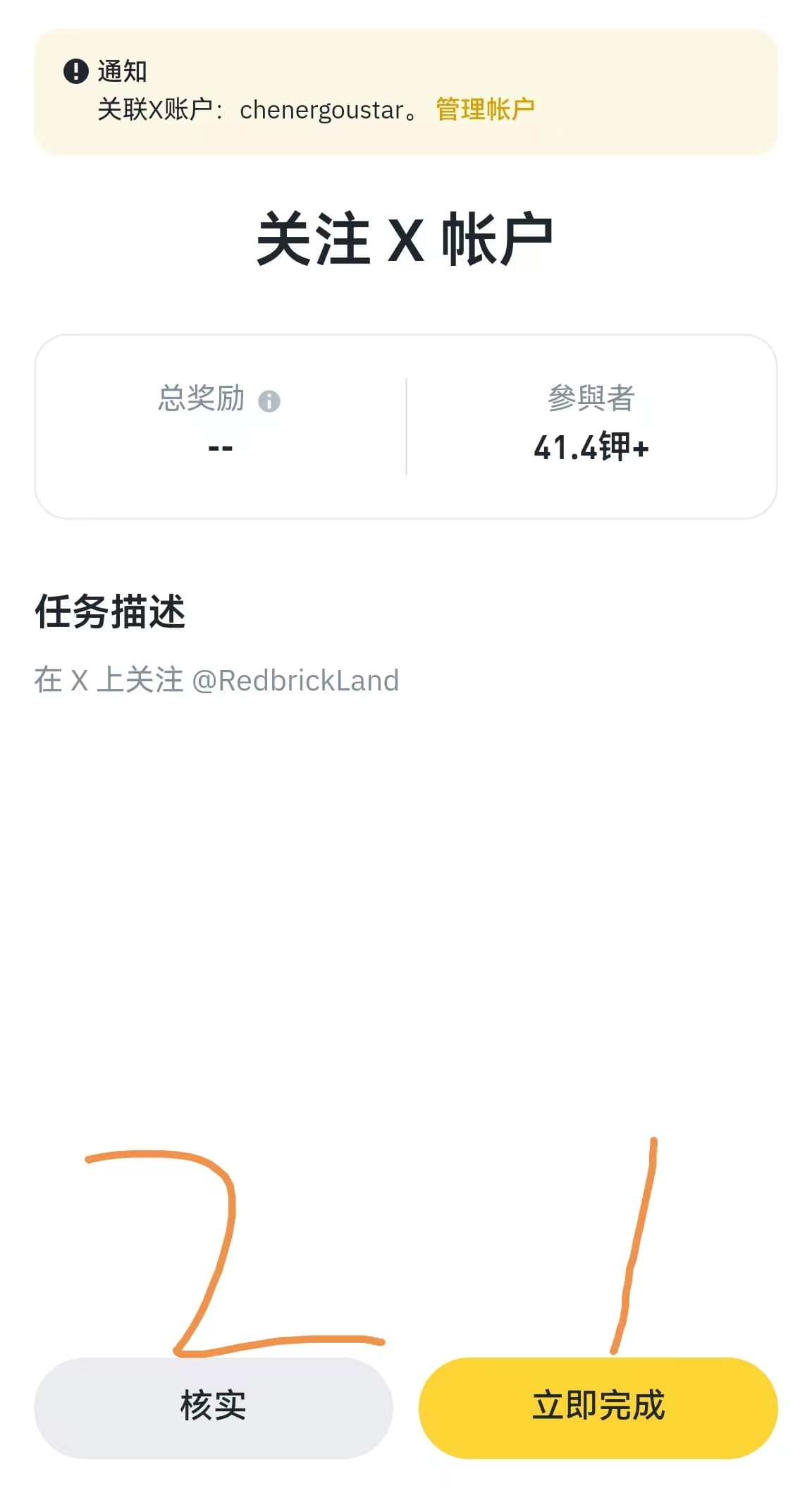 Apri il portafoglio web3 di Binance, trova il compito premio, entra, i primi due compiti più semplici sono ancora seguire Twitter (qui è necessario usare un VPN) clicca su completa il compito, dopo aver seguito clicca su verifica.