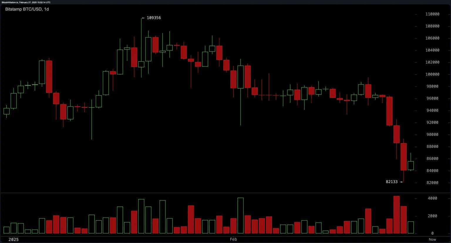 Grafico BTC/USD 1D tramite Bitstamp del 27 febbraio 2025.
