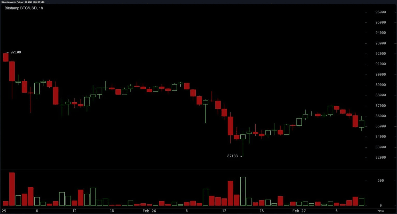 Il grafico a 1 ora di bitcoin segnala un leggero recupero dopo un minimo locale a $82.133, con i compratori che intervengono per stabilizzare i prezzi. Tuttavia, la resistenza a $86.000 rimane una barriera critica, impedendo un forte slancio al rialzo. Se bitcoin mantiene l'intervallo $84.000–$85.000, è possibile una rottura verso $88.000. Un fallimento nel mantenere questo livello di supporto potrebbe portare a un nuovo test di $82.000, rafforzando il sentimento ribassista più ampio.