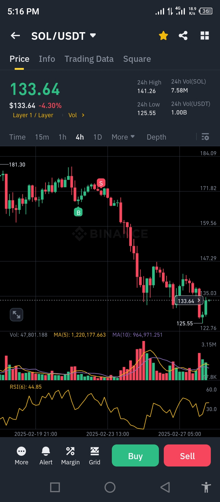 Secondo il grafico, SOL/USDT è stato in un trend ribassista di recente. Il prezzo è sceso da $181.30 a $125.55, indicando un calo del 30%. Questo suggerisce una forte pressione di vendita nel mercato.