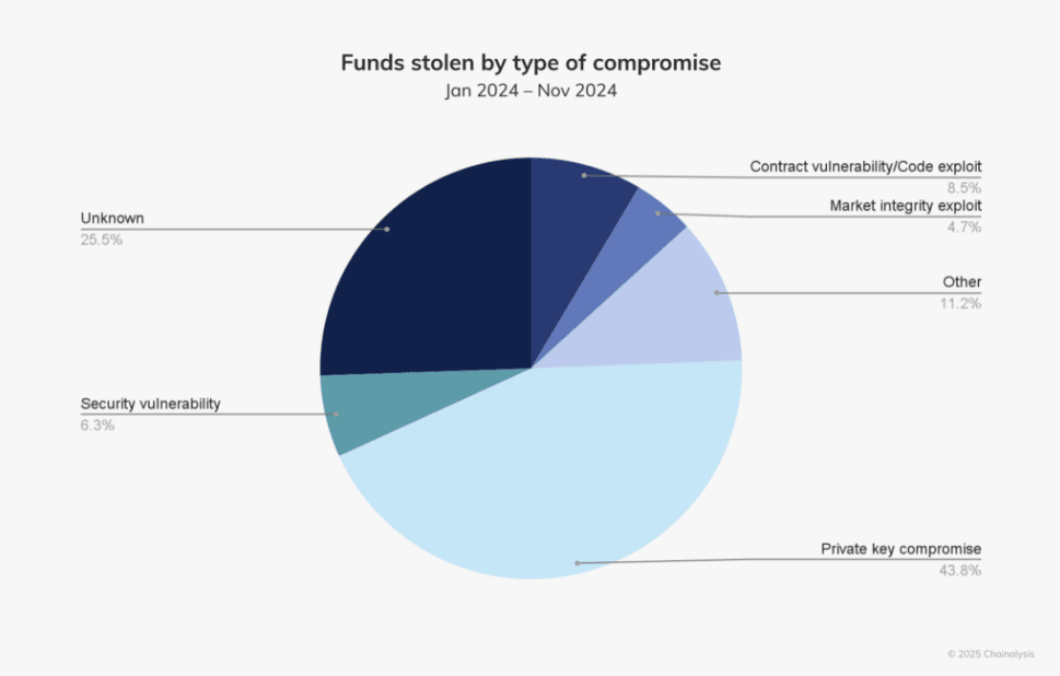 Questo spostamento di attenzione dai servizi DeFi a quelli centralizzati evidenzia l'importanza crescente dei meccanismi di sicurezza comunemente sfruttati negli hack, come le chiavi private. Le compromissioni delle chiavi private hanno rappresentato la fetta più grande di crypto rubata nel 2024, con il 43,8%. Per i servizi centralizzati, garantire la sicurezza delle chiavi private è fondamentale poiché controllano l'accesso agli asset degli utenti.