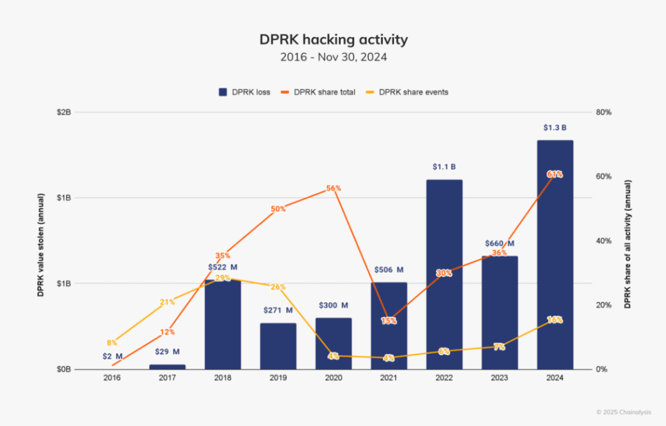 L'hack di Bybit è parte di una preoccupante tendenza all'aumento degli attacchi informatici sulle piattaforme di criptovalute. Nel 2024, gli hacker collegati alla Corea del Nord hanno rubato da soli circa 1,34 miliardi di dollari in 47 incidenti, un aumento del 102,88% rispetto ai 660,5 milioni di dollari rubati in 20 incidenti nell'anno precedente. L'hack di Bybit nel 2025 ha già superato l'intero importo rubato dalla Corea del Nord nel 2024 di quasi 160 milioni di dollari.
