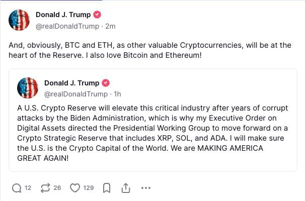 Nel suo ultimo tweet, Trump ha sottolineato che BTC ed ETH sono centrali per questa nuova riserva, definendoli "criptovalute preziose." Il suo Decreto Esecutivo sugli Asset Digitali ordina al Gruppo di Lavoro Presidenziale di accelerare questa strategia crypto, includendo XRP, SOL, ADA e ovviamente, Bitcoin. 💥