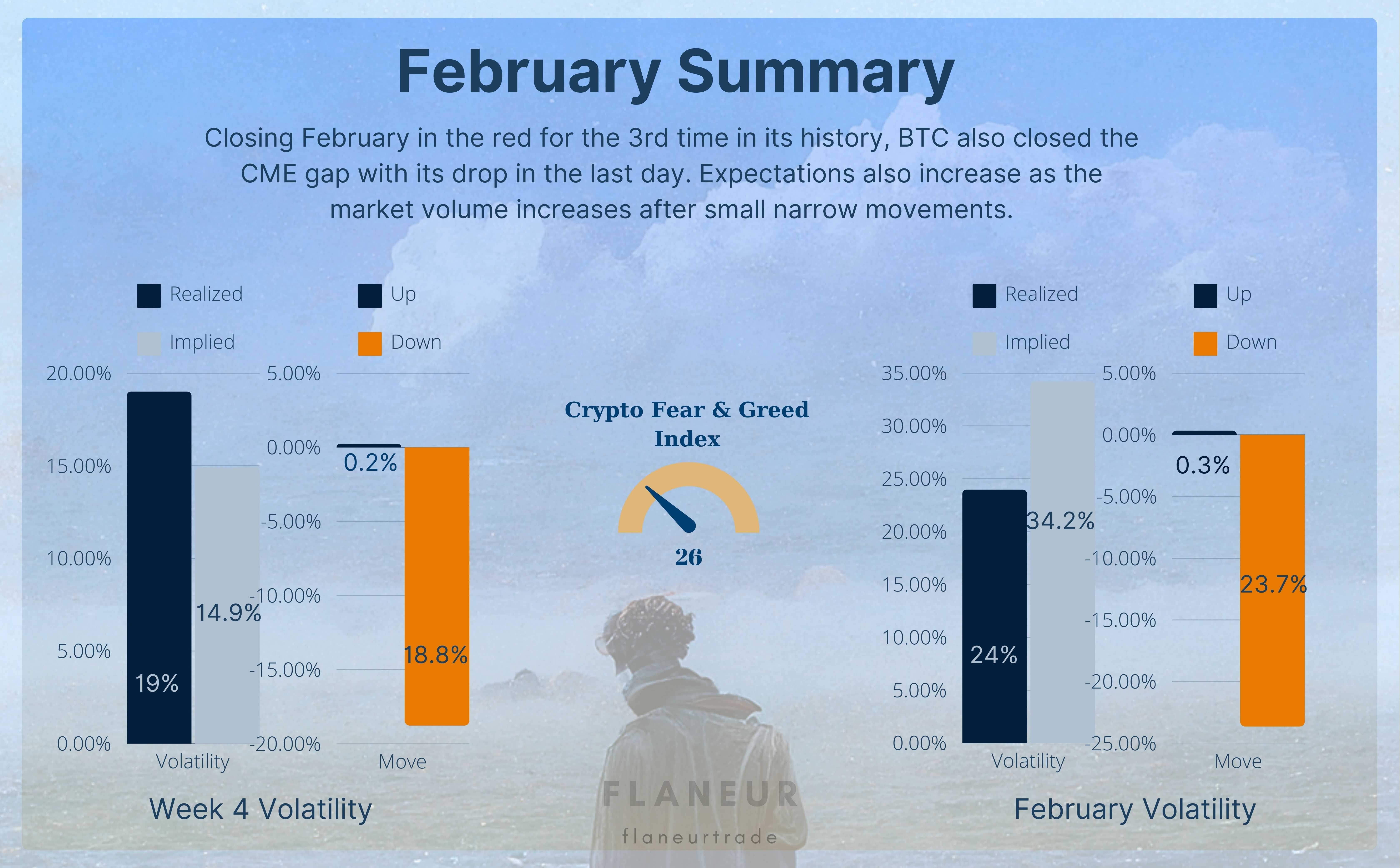 Il calo della scorsa settimana ha rotto il movimento di prezzo ristretto all'interno del mese. Sebbene la volatilità implicita mensile sia rimasta più bassa, i movimenti recenti hanno aumentato le aspettative di volatilità. Nonostante sia sceso sotto il supporto importante di 90k, è risalito sopra con l'apertura di marzo.