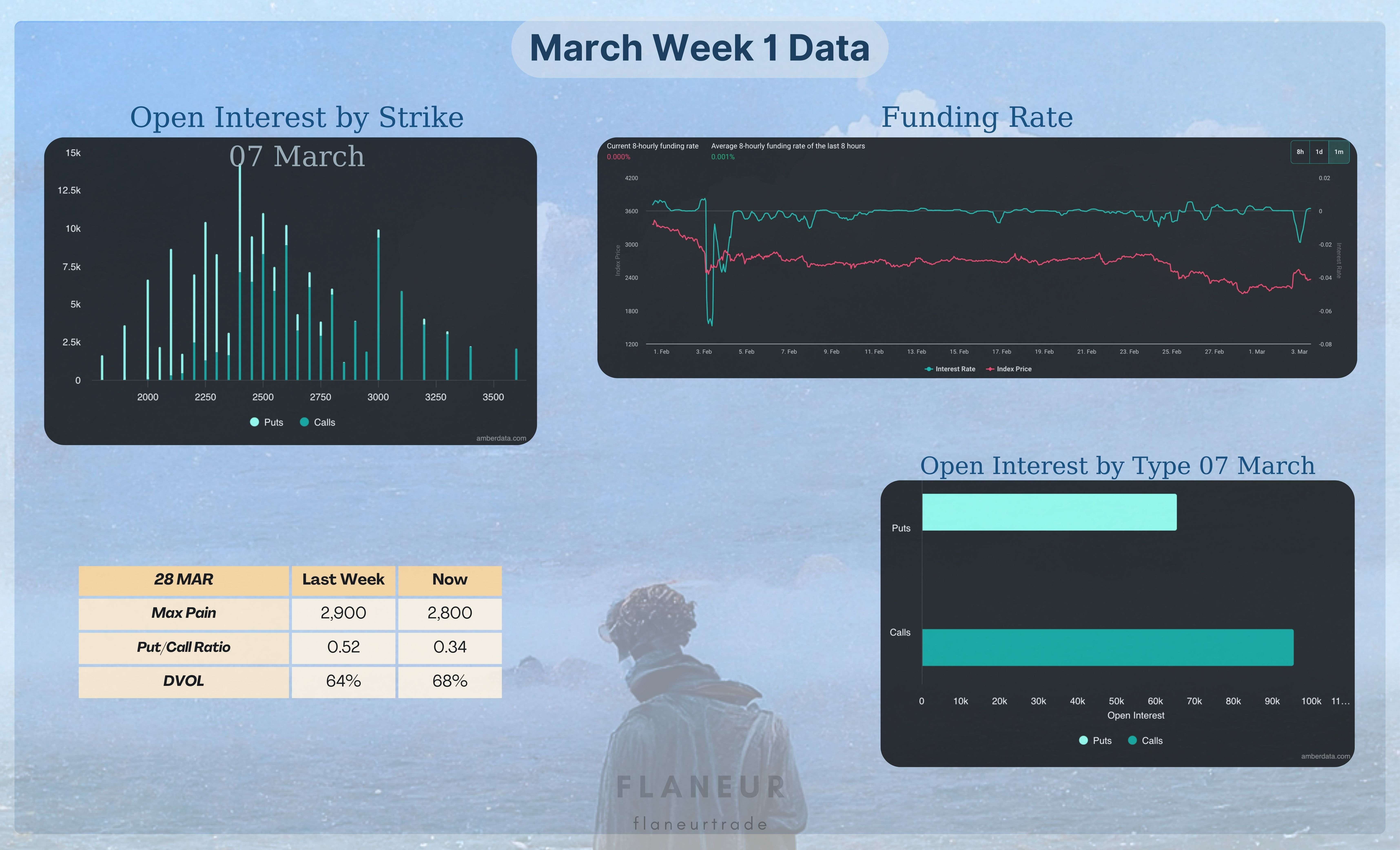 Per il 28 marzo, sono stati acquistati contratti per un valore di 2 miliardi di dollari, con il prezzo Max Pain a $2800. Il rapporto Put/Call a 0,34 indica aspettative molto ottimistiche. Il DVOL mostra un aumento del 68%.